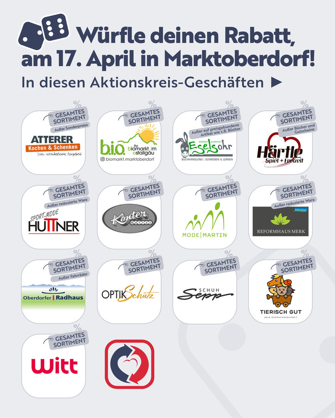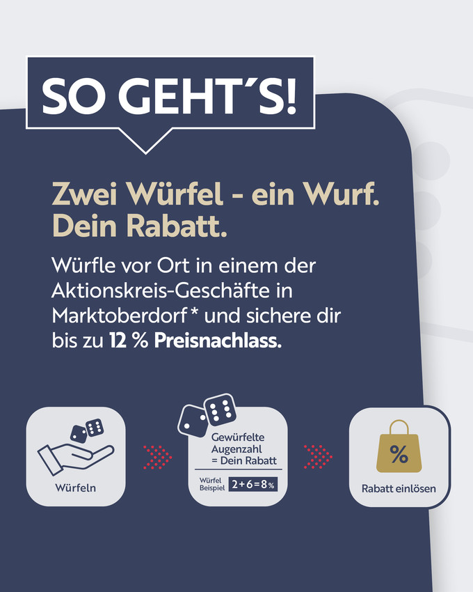 Besuchen Sie uns und die teilnehmenden Geschäften und würfeln Sie Ihren persönlichen Rabatt aus.